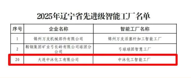 近日,省工信廳網(wǎng)站發(fā)布“2025年遼寧省數(shù)字化車間、先進(jìn)級(jí)智能工廠”擬定名單公示,大連中沐化工有限公司中沐化工智能工廠位列其中,擬獲得省先進(jìn)級(jí)智能工廠認(rèn)定