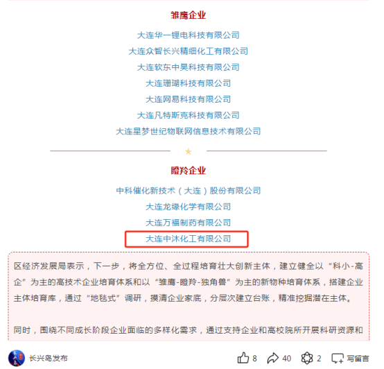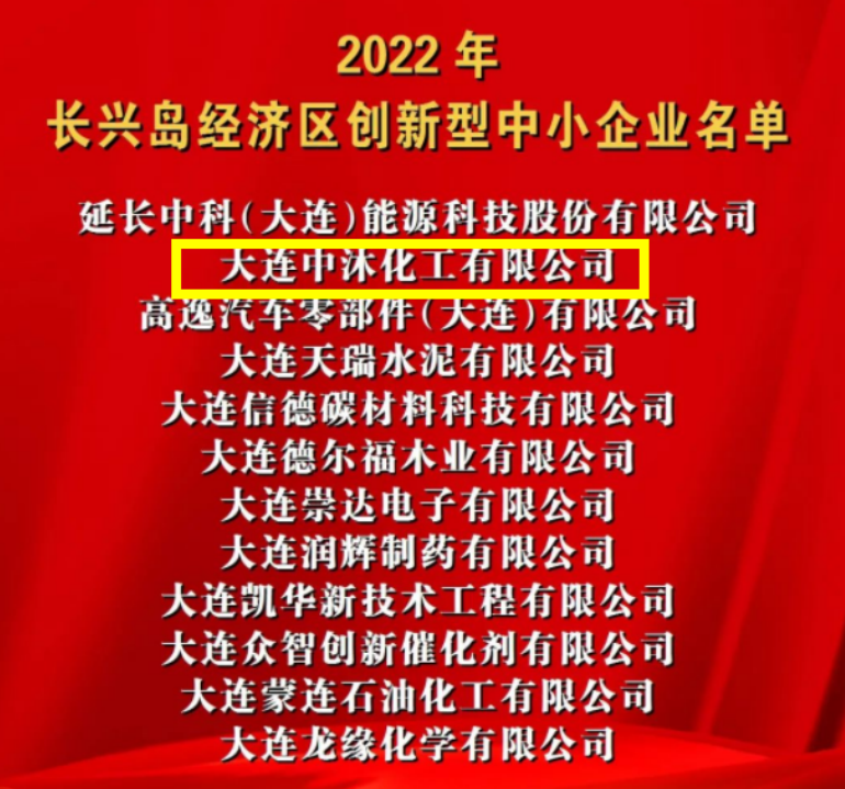 大連中沐化工有限公司被認(rèn)定為遼寧省瞪羚企業(yè)